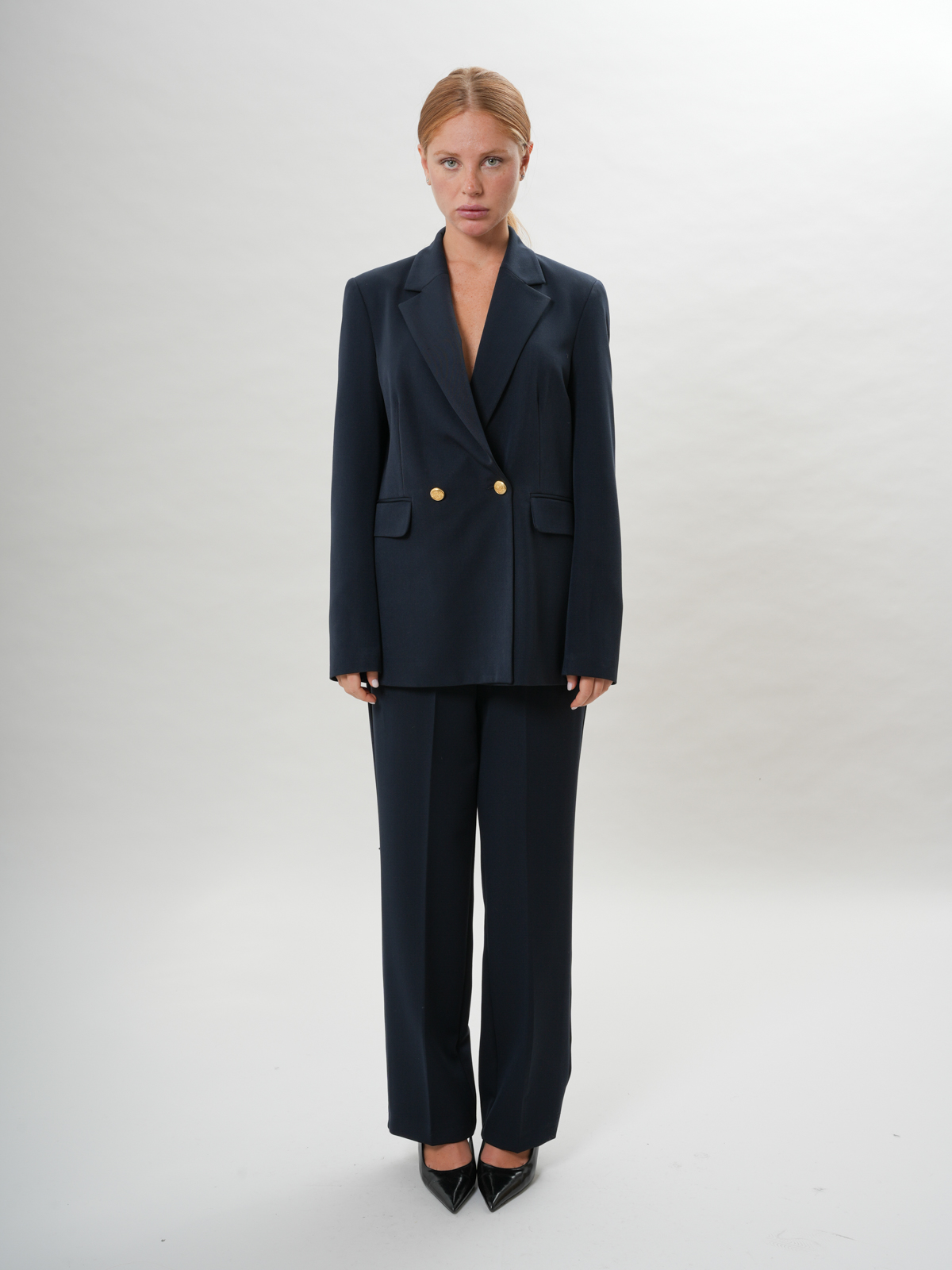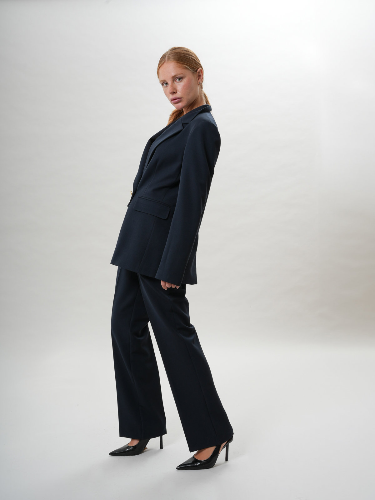 tailleur tinta unita, giacca doppio petto over con bottoni dorati, pantalone comodo a vita alta con elastico parte posteriore, tasca afilo